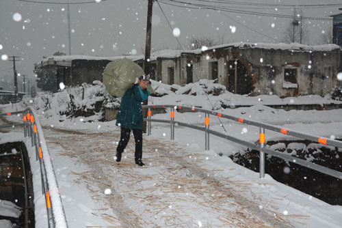 大雪阻礙了攬收郵,徒步攬收郵件,扛著郵包步行。