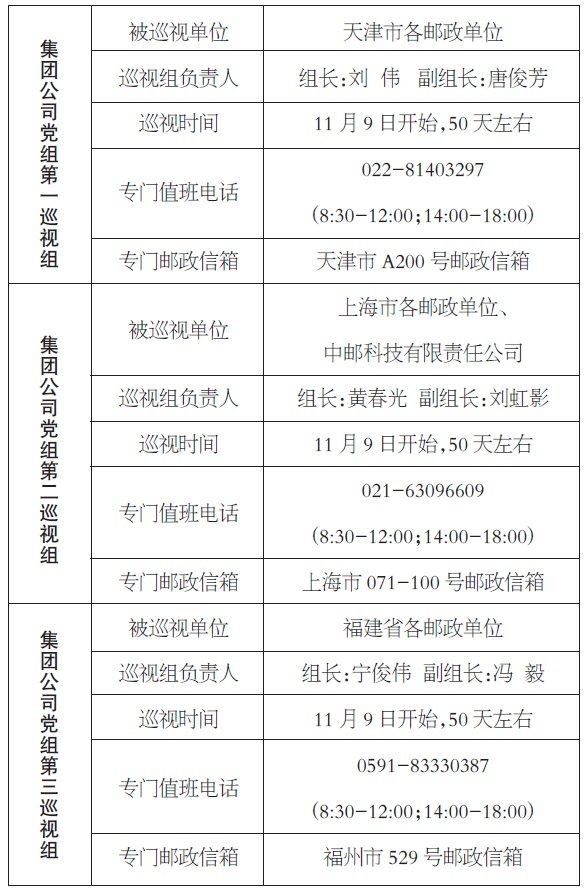 集團公司黨組首批巡視對集團公司天津市、上海市、福建省分公司,郵政儲蓄銀行天津、上海、福建省、廈門分行,中郵人壽保險公司天津、上海分公司,中郵證券公司上海、福建分公司,中郵科技有限責任公司等12個單位的黨委(黨組)領導班子及其成員開展常規(guī)巡視。