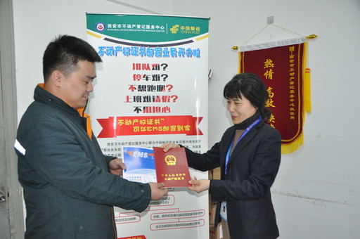 自11月29日起,陜西省西安市不動產登記服務中心正式受理群眾的不動產權證書郵寄業務,群眾在辦理二手房交易、房屋抵押注銷、權屬登記等業務時可提出郵寄服務申請,證書制作完成后可由EMS送達。這是西安市郵政寄遞事業部切入政府便民惠民工作、實現郵政便民服務的又一次拓展。圖為西安市不動產登記服務中心的工作人員將第一件要郵寄的證書交到EMS工作人員手中。 □張雪珂 攝影報道