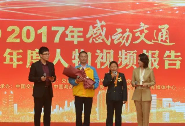 在2017年感動交通十大年度人物視頻報告會上,尼瑪拉木為見義勇為的上海蘇寧物流有限公司快遞員翟秋云獻上鮮花,并號召全國郵政快遞從業人員向他學習。