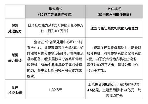 湖州申通常務副總經理汪大海對記者說:“集包模式更適合輕小件的處理和轉運。如果要改用散件外送的模式,我們的處理能力至少要降低三分之一。”根據浙江郵政提供的一組數據(見圖2),如果郵政全面采用集包模式,不僅能縮短郵件處理時限,還能大幅降低企業成本。