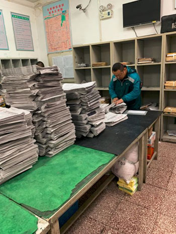 小梅每天上午送1100份報(bào)紙,下午送88份晚報(bào),包裹每天數(shù)量不一,我跟著她的這天,上、下午加起來83個(gè)。小梅說,最高峰的時(shí)候可經(jīng)常是100多個(gè)。