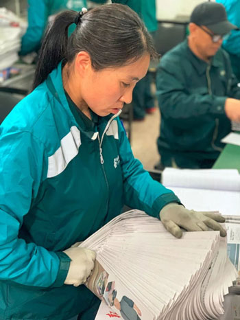東四郵局投遞部的早晨是從7點(diǎn)開始的。砸郵戳、數(shù)報(bào)紙、分信件,忙而不亂。幾十斤重的一厚摞報(bào)紙?jiān)业阶雷由希灰娝麄冇沂忠环兂善恋纳让妫笫帜粗负褪持敢惶б粔嚎焖俾舆^,轉(zhuǎn)瞬間每個(gè)人就數(shù)出了自己要送的報(bào)紙數(shù)量。