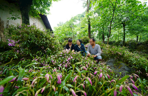 穿過竹林,孫茂梅來到農戶袁二妹家的石斛花田。蒼翠的樹叢間,粉紫色的石斛花滿山滿谷,一簇簇、一團團,散發著淺淺的清香。