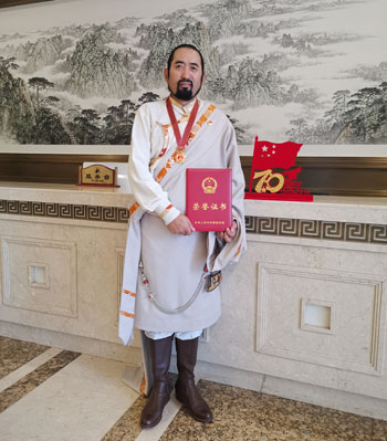 四川省甘孜藏族自治州甘孜縣郵政分公司長途郵運駕駛員其美多吉榮獲全國民族團結進步模范個人稱號,習近平總書記親自為其美多吉頒發(fā)獎章和證書。