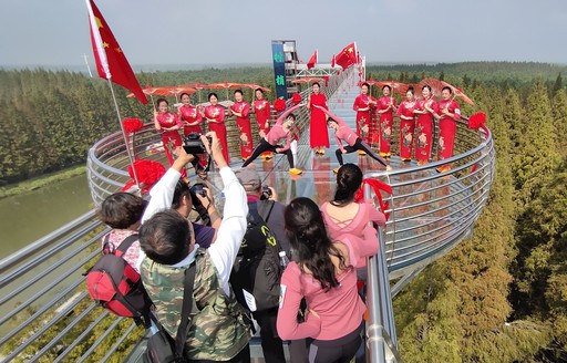10月1日,江蘇省金湖縣郵政分公司工會與金湖電信分公司、金湖移動分公司工會一起,組織本單位部分女職工來到銀涂鎮萬畝水森林,開展了“郵電女職工與國旗同框”主題活動。郵電女職工們身著旗袍登上高33.18米、長288.18米的“樹梢王國”,與高高飄揚的國旗合影,慶祝新中國成立70周年?! 跫獱栐?nbsp; 攝影報道