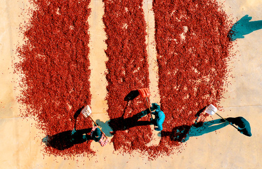 除了銀杏,辣椒市場也給郵政業(yè)務(wù)拓展帶來了新的機(jī)遇。這不,紅火的晾曬場上也有綠衣人幫扶的身影。