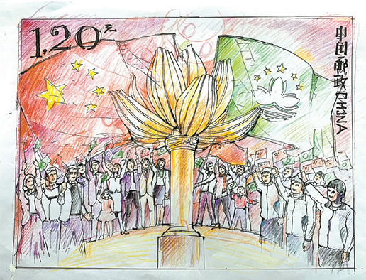 問及同為韓秉華設(shè)計(jì)的《澳門回歸祖國二十周年》與兩年前的《香港回歸祖國二十周年》郵票有什么變化,他表示:“整體風(fēng)格差不多,只是構(gòu)圖不一樣,澳門回歸的相對復(fù)雜一些,光是畫面中的人物就多了不少,場面顯得更為熱鬧。”