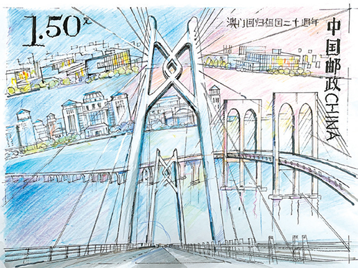 “《澳門回歸祖國二十周年》與《粵港澳大灣區(qū)》兩套郵票是今年5月同時(shí)約稿的,設(shè)計(jì)也是穿插進(jìn)行,因?yàn)槲覍Π拈T感受更為深刻,加之這套郵票的內(nèi)容相對集中,所以設(shè)計(jì)比較順利,在《粵港澳大灣區(qū)》郵票完成三周后就提交了這套郵票的圖稿。”韓秉華饒有興致地回憶道。