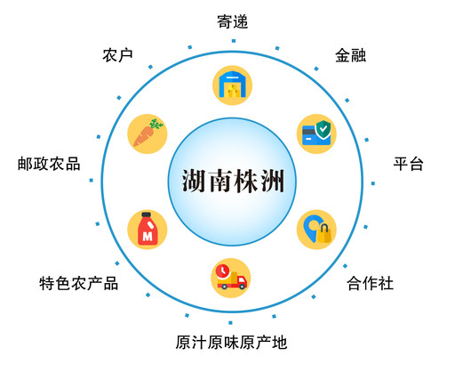 圍繞特色農產品,堅持“原汁原味原產地”的價值主張,構建“基地+合作社+農戶+平臺+金融+寄遞”的服務模式,拓展前方市場、建設后方基地、夯實中間保障,打造“郵政農品”品牌。這一生態模式在湖南株洲得到了最佳實踐。