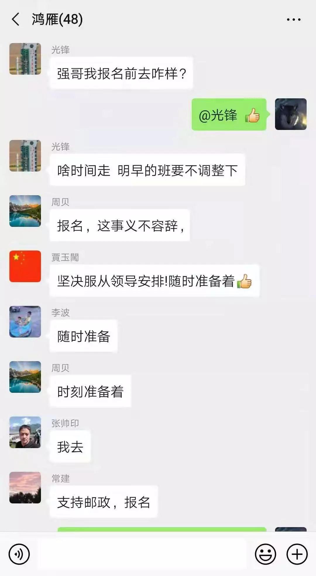 “堅(jiān)決服從安排!隨時(shí)準(zhǔn)備著”“報(bào)名,這事義不容辭”“堅(jiān)決支持,我報(bào)名”……1月26日,在南陽市分公司網(wǎng)運(yùn)條線微信群里,當(dāng)?shù)弥枰獌擅救ノ錆h運(yùn)送防疫物資時(shí),許多人紛紛踴躍報(bào)名,請戰(zhàn)前線,表示要以自己的實(shí)際行動(dòng)為抗擊疫情貢獻(xiàn)力量。