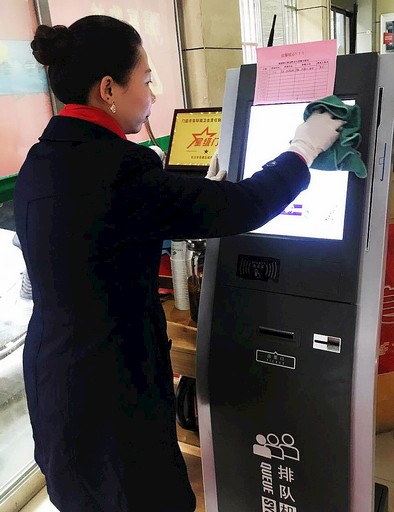 湖南省長沙市岳麓區郵政分公司日前組織員工對網點進行全面消毒,并在機具上粘貼“本日已消毒”告示。要求網點每日安排專人負責消毒工作,讓郵政客戶放心進入網點辦理郵政業務。圖為銀盆嶺郵政網點員工對叫號機進行消毒。□桂藝 攝影報道