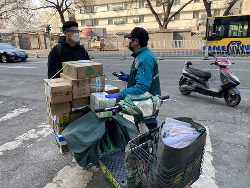 2月19日9點半,寒風中,東四郵局北新橋投遞部投遞員張志福戴著護目鏡、口罩、一次性手套,站在某小區(qū)門口,一個接一個地撥通收件人的電話,等待他們來領取包裹。11天前,這個小區(qū)出現(xiàn)一例新冠肺炎確診病例。從那時開始,附近的居民都繞著這個小區(qū)走。