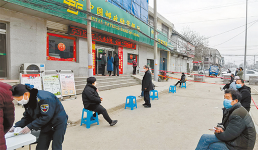 山東菏澤郵政農(nóng)村支局在營業(yè)廳外設(shè)立等待專區(qū),客戶測量體溫并消毒后方可進入廳堂辦理業(yè)務(wù)。 李慶昌 提供