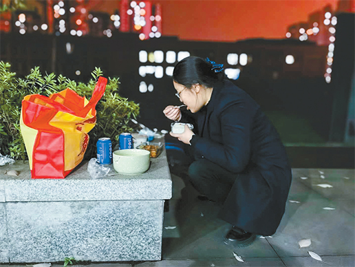 晚上9:00,學(xué)府第一小學(xué)封裝現(xiàn)場,已經(jīng)是輾轉(zhuǎn)封裝的第4 所學(xué)校,沙坪壩曾家支局宋倩在封裝間隙將就吃點(diǎn)晚飯。向巍 攝