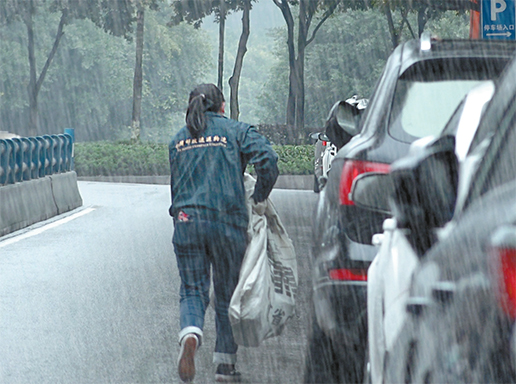 江北寄遞事業(yè)部幫扶人員陳俊蘭投遞途中突遇大雨,她知道教材有防護(hù),為節(jié)省時(shí)間,顧不上打傘一路猛跑。 朱亞坤 攝
