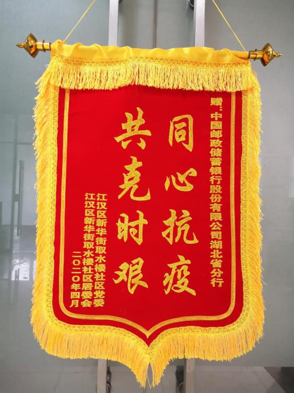 近日,江漢區新華路取水樓社區授予郵儲銀行湖北省分行黨員突擊二隊“抗疫”錦旗,表彰其在疫情期間與廣大社區居民“同心抗疫、共克時艱”的特殊貢獻。