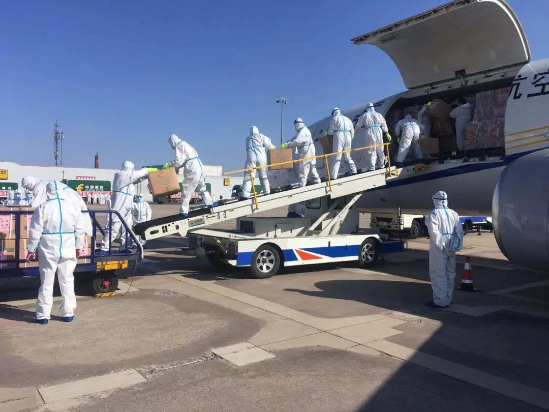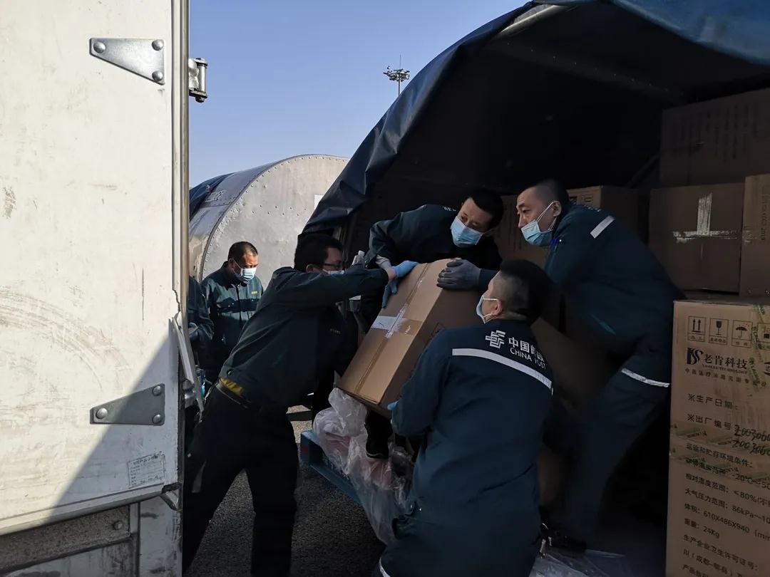 牡丹江機場地面保障人員接卸郵航包機運抵的醫用物資。