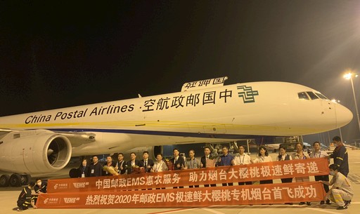 6月2日23:20,一架載有24噸優質煙臺大櫻桃的中國郵政航空公司B757貨運專機從蓬萊國際機場起飛,80分鐘后抵達南京,全國各地的買家可在24小時內品嘗到新鮮美味的煙臺大櫻桃。這拉開了2020年郵政極速鮮大櫻桃寄遞首飛直航的序幕。