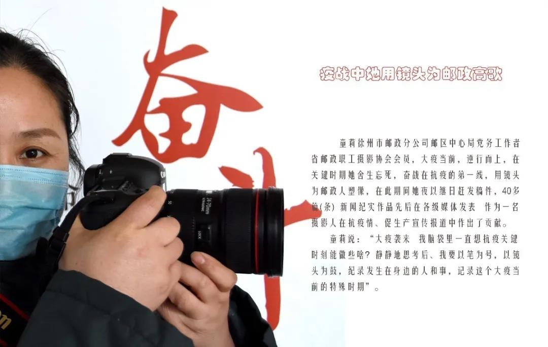 童莉,江蘇省徐州市郵政分公司郵區中心局黨務工作者。大疫當前,逆行而上,在關鍵時期她舍生忘死,奮戰在第一線,用鏡頭為郵政人塑像,疫情期間有40多篇(條)新聞紀實作品先后在各級媒體發表,在抗疫情促生產宣傳報道中作出了應有的貢獻。