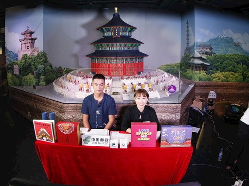 北京郵政邀請的主播在“大城小像·北京”城市微縮景觀博物館現(xiàn)場直播帶貨故宮系列郵品。