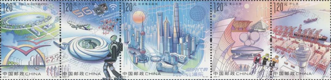 30年來,浦東在一片阡陌農(nóng)田上建成了一座功能集聚、要素齊全、設(shè)施先進(jìn)的現(xiàn)代化城市,成為我國改革開放的象征和上海現(xiàn)代化建設(shè)的縮影。歷史是發(fā)展的見證,郵票是時(shí)代的剪影。此次發(fā)行的《新時(shí)代的浦東》特種郵票,鮮活呈現(xiàn)了浦東勇?lián)鷩覒?zhàn)略、奮進(jìn)新時(shí)代的生動(dòng)實(shí)踐,有力彰顯了中國特色社會(huì)主義的強(qiáng)大生命力。郵票一套5枚,選取上海自貿(mào)試驗(yàn)區(qū)、張江科學(xué)城、陸家嘴金融城、浦江東岸、洋山港等作為表現(xiàn)主題,將浦東日新月異的變化濃縮于方寸之間。