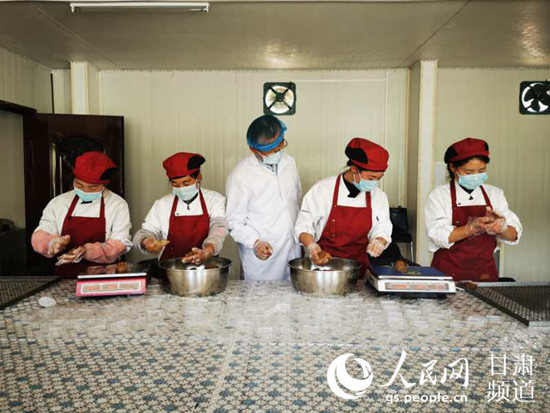 工作人員制作糌粑點(diǎn)心。(郵儲(chǔ)銀行甘肅省分行供圖)