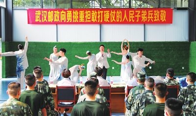 “八一”建軍節(jié)前夕,武漢郵政藝術(shù)團走進駐守長江大橋的武警部隊軍營,為官兵送去《強軍之路》郵冊等郵品和書籍,并表演了精彩的文藝節(jié)目。部隊官兵也為前來慰問的郵政工作人員表演了精彩的擒拿格斗和舞獅節(jié)目,營造了雙擁共建促和諧的濃厚氛圍。多年來,武漢郵政通過“擁軍郵路”積極關心軍營戰(zhàn)士,提供不間斷、多元化的郵政服務。在今年疫情防控期間,武漢郵政不間斷投送黨報黨刊和各類物資,得到了官兵們的一致好評。□肖芳 攝影報道