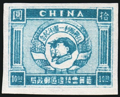 2.抗戰(zhàn)勝利后,各根據地陸續(xù)發(fā)行了抗戰(zhàn)勝利紀念郵票。晉察冀邊區(qū)于1945年到1946年發(fā)行的該題材郵票主圖為“八路健兒疆場殺敵圖”,并且以此圖案發(fā)行過兩次郵票,根據票幅大小不同分別稱作“抗戰(zhàn)勝利紀念大型郵票”(俗稱“大抗戰(zhàn)”)和“抗戰(zhàn)勝利紀念小型郵票”(俗稱“小抗戰(zhàn)”)。晉冀魯豫邊區(qū)分別于1947年3月和7月發(fā)行了“抗戰(zhàn)勝利一周年紀念郵票”和“抗戰(zhàn)勝利二周年紀念郵票”,兩套郵票主圖相同,顏色不同,均為毛澤東主席和朱德總司令的側面像,這是抗戰(zhàn)期間指揮邊區(qū)軍民抗擊日寇的兩位領袖。東北區(qū)1947年發(fā)行了三種紀念抗戰(zhàn)的郵票,7月7日發(fā)行的“七七”抗戰(zhàn)十周年紀念郵票及小全張,主圖為一只有力的手臂緊握一支步槍,表示面對敵人的侵略,全民抗戰(zhàn)的決心;8月15日發(fā)行的“八一五”東北解放二周年紀念郵票,主圖為陽光照射下的白山黑水,兩側為大豆、高粱,表現解放后的東北豐衣足食,生活美好;9月18日發(fā)行的“九一八”紀念郵票,主圖為東三省地圖,兩側分別為“反對美蔣反動派制造二次滿洲國”的文字,在紀念“九一八”事變的同時,也宣傳了當時的斗爭形式。山東區(qū)發(fā)行的“抗日民族戰(zhàn)爭勝利紀念郵票”,主圖是毛澤東揮手指引人民奔向光明的前程,表示勝利后,人民希望建立一個富強民主的新中國的美好愿望。東北區(qū)還于1949年8月15日發(fā)行了“八一五”四周年紀念郵票,主圖為東北抗日暨愛國自衛(wèi)戰(zhàn)爭烈士紀念塔。1946年12月,山東區(qū)發(fā)行了“膠東抗日烈士紀念塔圖郵票”,主圖為紀念塔,緬懷膠東抗戰(zhàn)中犧牲的烈士。