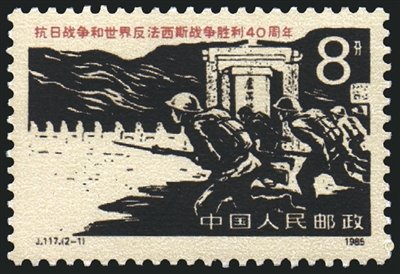 3.新中國成立后發(fā)行的抗戰(zhàn)紀念郵票,郵票主圖取材廣泛,圖案名稱多用抗戰(zhàn)史實名稱來命名。1952年7月7日發(fā)行的紀16“抗日戰(zhàn)爭十五周年紀念”郵票,分別為“盧溝橋風云”“平型關勝利”“歡送新四軍抗日”“領袖策劃反攻”,4枚郵票圖案定格抗戰(zhàn)中4個有代表性的場景。1965年9月3日發(fā)行的紀115“紀念抗日戰(zhàn)爭勝利二十周年”郵票,1套4枚,“毛主席在著作”一圖描繪了毛澤東在延安窯洞里寫作《論持久戰(zhàn)》的情景;“八路軍東渡黃河”郵票圖案為八路軍戰(zhàn)士在黃河邊準備東渡,奔赴抗日戰(zhàn)爭前線的場面;“人民戰(zhàn)爭勝利”主圖為取得抗日戰(zhàn)爭勝利的八路軍、新四軍和游擊隊戰(zhàn)士在歡呼勝利的場景;“光榮參軍”主圖為人民群眾積極參加人民軍隊,加入抗戰(zhàn)隊伍的情景。1985年9月3日發(fā)行的J.117“抗日戰(zhàn)爭和世界反法西斯戰(zhàn)爭勝利40周年”郵票,1套2枚,“盧溝橋中國軍隊奮起抗日”描繪了抗日戰(zhàn)爭中國民黨二十九軍將士沖鋒陷陣、奮勇抗戰(zhàn)的英雄形象;“八路軍和民兵戰(zhàn)斗在長城內外”展現了八路軍配合民兵浴血奮戰(zhàn),共同打擊日寇的光輝形象。1995年9月3日發(fā)行的“抗日戰(zhàn)爭和世界反法西斯戰(zhàn)爭勝利五十周年”郵票,1套8枚,分別為“戰(zhàn)火”“臺兒莊大捷”“百團大戰(zhàn)”“敵后游擊戰(zhàn)”“芒友會師”“華僑捐獻”“臺灣光復”“偉大勝利”。分別描繪了盧溝橋戰(zhàn)斗、臺兒莊大捷、百團大戰(zhàn)、敵后游擊戰(zhàn)、芒友會師的場景,以及華僑捐獻、歡慶臺灣光復、日本正式投降簽字儀式的勝利場面。2005年8月15日發(fā)行的“中國人民抗日戰(zhàn)爭暨世界反法西斯戰(zhàn)爭勝利六十周年”郵票,1套4枚及1枚小型張,“全民抗戰(zhàn)”展現的是國共兩黨軍隊和人民群眾并肩作戰(zhàn)的場面;“中流砥柱”主圖為一名八路軍戰(zhàn)士吹響沖鋒號,展現了八路軍在抗戰(zhàn)中的重要作用;“諾曼底登陸”主圖為登陸后手持步槍的美軍士兵;“攻克柏林”主圖為蘇軍歡呼勝利的場景;小型張主圖為一只沖破鐵絲網的白色和平鴿,寓意和平與正義沖破了戰(zhàn)爭的主題。2015年9月3日發(fā)行的“中國人民抗日戰(zhàn)爭暨世界反法西斯戰(zhàn)爭勝利七十周年”郵票,1套13枚及1枚小型張,郵票圖案背景表現的是中國抗戰(zhàn)中的13個經典事件場面,主圖是與該事件相關的紀念場館:“九一八”歷史博物館、東北烈士紀念館、中國人民抗日戰(zhàn)爭紀念館、上海淞滬抗戰(zhàn)紀念館、侵華日軍南京大屠殺遇難同胞紀念館、臺兒莊大戰(zhàn)紀念館、延安革命紀念館、八路軍總部舊址紀念館、百團大戰(zhàn)紀念館、平型關大捷紀念館、冉莊地道戰(zhàn)紀念館、新四軍紀念館、滇西抗戰(zhàn)紀念館;小型張畫面以《大刀進行曲》雕塑為主圖,高度概括、反映了全民抗戰(zhàn)的主題。