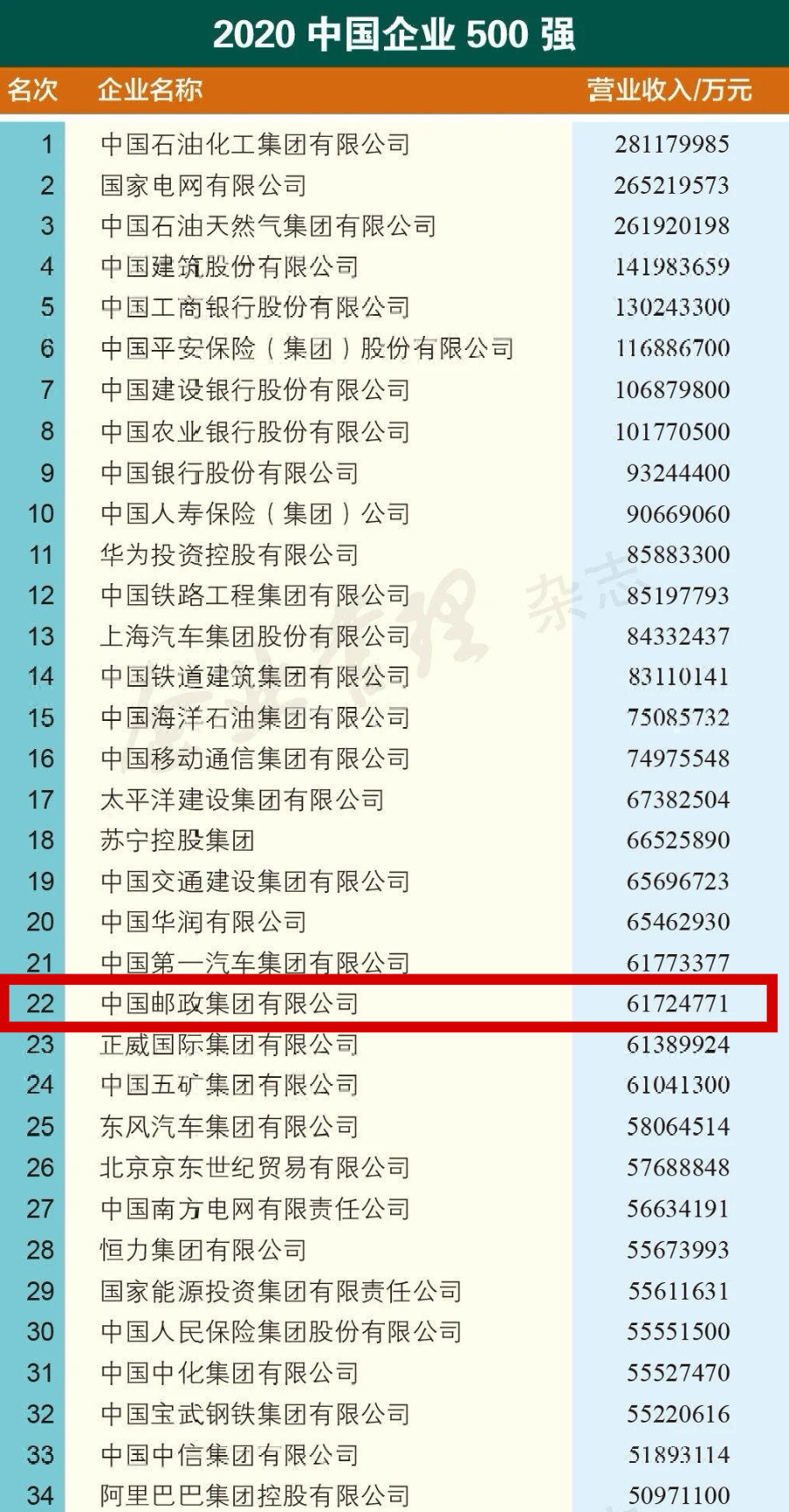 9月28日,在2020中國500強(qiáng)企業(yè)高峰論壇上,中國企業(yè)聯(lián)合會、中國企業(yè)家協(xié)會連續(xù)第19次向社會發(fā)布“中國企業(yè)500強(qiáng)”榜單。其中,中國郵政集團(tuán)有限公司位列第22位,比去年上升3位。