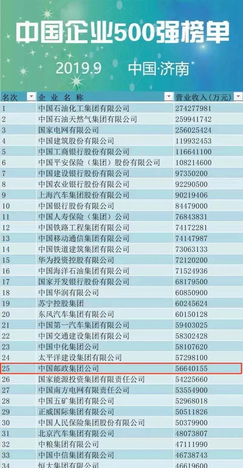 中國郵政在2019中國企業(yè)500強(qiáng)榜單上排名就比2018年上升3位。