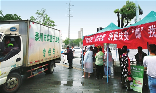 泰州郵政與泰州農(nóng)業(yè)農(nóng)村局聯(lián)合舉辦“新型農(nóng)業(yè)經(jīng)營(yíng)主體農(nóng)副產(chǎn)品社區(qū)行”公益助農(nóng)活動(dòng)。□周群峰 攝