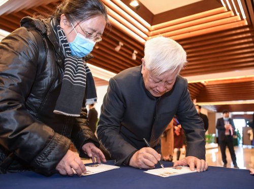 1月5日,《辛丑年》特種郵票設計者、藝術家姚鐘華(右)在北京的首發儀式現場為集郵愛好者的《辛丑年》特種郵票首日封簽名。新華社記者 李賀 攝
