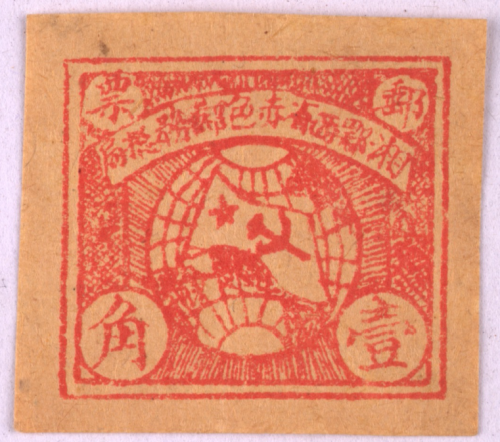 據(jù)集郵學(xué)者考證,“壹角郵票”由湘鄂西省郵政總局(湘鄂西省赤色郵務(wù)總局)發(fā)行,郵票圖幅24×22毫米,黃紙上刷紅色,石印,無(wú)齒孔。主體圖案為:地球中央套一面鐮錘、五星圖案的旗幟;地球周圍放射狀紋;地球圖案上方自右至左印有弧形排列的正楷“湘鄂西省赤色郵務(wù)總局”字樣,四角圓形開光分別印有宋體“郵票”“壹角”字樣。