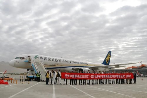 5月25日5點23分,一架噴涂著中國郵政航空的波音757-200飛機,從四川成都雙流國際機場起飛,7點17分安全飛抵西藏拉薩貢嘎國際機場,后續按計劃順利完成在拉薩貢嘎機場全發起飛、進近以及模擬單發失效復飛等計劃驗證科目。至此,由民航北京監督管理局組織的中國郵政航空高高原和RNP AR程序驗證試飛取得了圓滿成功,在西藏和平解放70周年之際,“祝賀中國郵政航空B757-200拉薩機場高高原航線實地驗證試飛成功”的橫幅,在高原上獵獵展開。