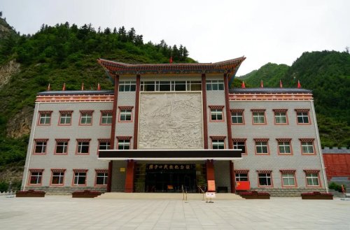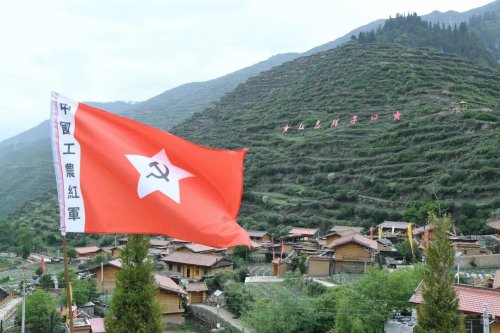 沿著迭部的山路逶迤前行,只見道路兩旁紅旗招展,一個個五角星掛在樹上隨風搖曳,紅色的民宅依山而建,墻面上刻畫著紅軍故事,紅房碧草黛山在藍天白云的映襯下甚是吸睛,碩大的“紅色臘子口”標語,無不提醒著我們,臘子口近了更近了。