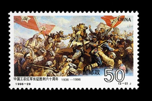 1996年10月22日,為了宣揚中國工農紅軍二萬五千里長征精神,《中國工農紅軍長征勝利六十周年》紀念郵票發行。全套郵票共2枚,圖案分別采用了一組群雕《過草地》和一幅油畫《三軍大會師》。