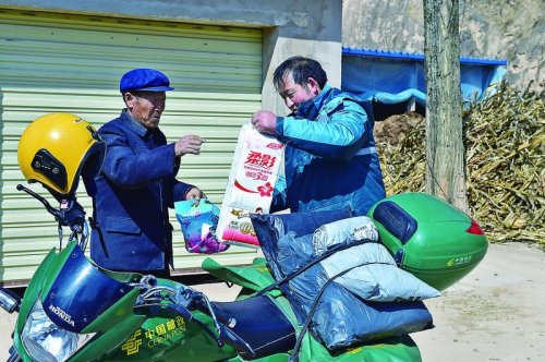 在趙滿(mǎn)明的摩托車(chē)上,經(jīng)常會(huì)出現(xiàn)與工作“不相符”的物品,有時(shí)是衛(wèi)生紙等生活用品,有時(shí)是瓜果蔬菜,這都是他幫投遞區(qū)域內(nèi)生活不便的群眾代買(mǎi)的物品。“我每天都來(lái)往在鎮(zhèn)上,幫他們代買(mǎi)一些生活用品,都是舉手之勞。”趙滿(mǎn)明輕描淡寫(xiě)地說(shuō)。