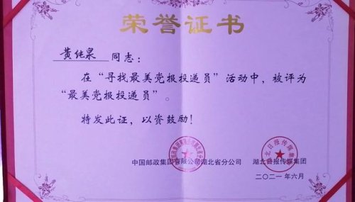 7月20日,荊州市郵政分公司相關(guān)負(fù)責(zé)人告訴記者,在中國(guó)共產(chǎn)黨百年華誕之際,黃純?nèi)@得湖北日?qǐng)?bào)、湖北省郵政分公司聯(lián)合表彰的“最美黨報(bào)投遞員”稱號(hào),屬荊州市唯一。記者立即聯(lián)系到了黃純?nèi)?/p>