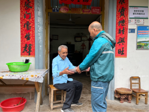 下一站是同村村民翁錫友家,他正跟幾個村民一起里外忙活。看到鄭衛星來了,幾個人便紛紛迎上來問好,“在忙什么”“吃了沒”……短暫寒暄后,幾個人很默契地快速分走了鄭衛星手上的信件、報刊和包裹。