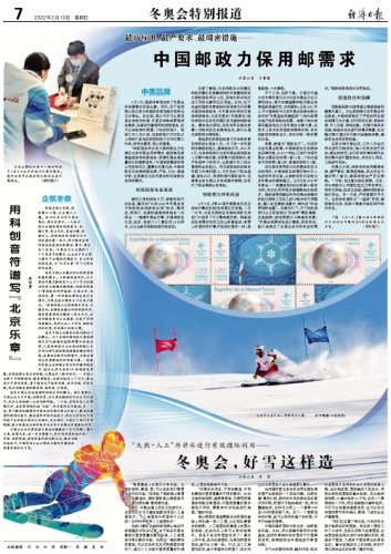 在弘揚(yáng)優(yōu)秀傳統(tǒng)文化和奧林匹克文化的同時(shí),中國郵政在郵票印制中引入先進(jìn)的科技手段,以嶄新的形式呈現(xiàn)北京冬奧會(huì)的精彩魅力。以《北京2022年冬奧會(huì)——競賽場館》紀(jì)念郵票小型張為例,首次應(yīng)用菲涅爾透鏡微納光刻技術(shù)。國家速滑館建設(shè)所用的剩余玻璃材料經(jīng)過特殊工藝加工成50微米的可用顆粒,摻入紅色雕刻油墨中,制作成“冰絲帶特種油墨”。在紫光燈下,方寸間的場館可以立即呈現(xiàn)出“冰絲帶”霓虹璀璨、光影流轉(zhuǎn),場館周圍燈火輝煌的夜景?!岸瑠W會(huì)郵票郵品設(shè)計(jì)精美,很受歡迎,極大地滿足了各國運(yùn)動(dòng)員和來賓的需求?!眹亦]政局局長馬軍勝說。