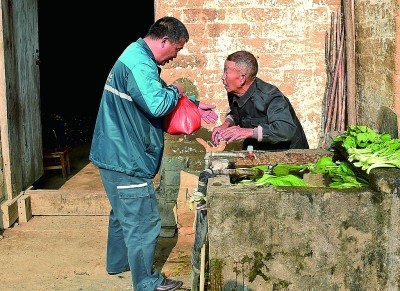 在安徽太湖縣北中鎮(zhèn)桐山村,郵遞員吳義陽將代購(gòu)的糯米送到老人手中。 新華社發(fā)