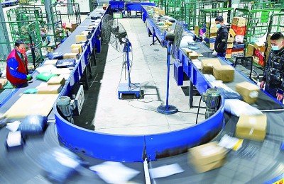 在中國(guó)郵政衡陽郵區(qū)中心局郵件處理中心,工作人員在分揀快遞包裹。 新華社發(fā)