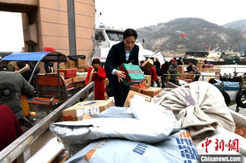 船一到,在碼頭等待已久的蔣玉美就熟練地從隨船貨物中,挑選出屬于郵政公司的郵件和包裹。“今天有100多件,大多是村民網(wǎng)購(gòu)的生活用品。”蔣玉美稱,每天一班的客船在中午到達(dá),她就會(huì)到碼頭接收,分揀后進(jìn)行投遞。
