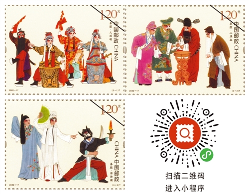 該套郵票全套3枚,郵票圖案名稱分別為“火焰駒”“三滴血”“游西湖”。郵票選取了《火焰駒》《三滴血》《游西湖》3部秦腔經(jīng)典傳統(tǒng)劇目的精彩片段,分別表現(xiàn)了銅錘花臉、文武小生、丑角、老生、小生、小旦等典型戲曲人物形象,原畫為絹本設(shè)色,采用中國傳統(tǒng)工筆畫法,運(yùn)用粗獷的線條、濃烈的色彩,以呼應(yīng)秦腔獨(dú)特的藝術(shù)風(fēng)格,同時(shí)結(jié)合淡雅的背景,烘托前景重彩戲曲人物,增添了畫面的古風(fēng)雅韻。