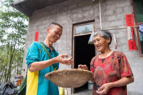 9月15日,投遞員張永洪(左)將快遞送到行動不便的老人手中。