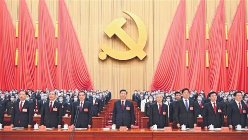 人民大會堂雄偉莊嚴,萬人大禮堂氣氛熱烈。主席臺上方懸掛著“中國共產黨第二十次全國代表大會”的會標,后幕正中是鐮刀和錘頭組成的黨徽,10面鮮艷的紅旗分列兩側。二樓和三樓眺臺上分別懸掛著“高舉中國特色社會主義偉大旗幟,全面貫徹習近平新時代中國特色社會主義思想,弘揚偉大建黨精神,為全面建設社會主義現代化國家、全面推進中華民族偉大復興而團結奮斗!”“偉大、光榮、正確的中國共產黨萬歲!”的橫幅。