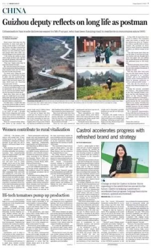 3月31日,《中國日報》旗艦版、香港版7版頭條刊發《Guizhou deputy reflects on long life as postman (全國人大代表莫富元的二十八載郵遞路)》。