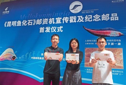 “5·18”國際博物館日當天,《昆明魚化石》郵資機宣傳戳及系列紀念郵品首發儀式在西北大學博物館舉行。此次發行的《昆明魚化石》郵資機宣傳戳及明信片、信封一套,郵資機宣傳戳以昆明魚化石及昆明魚復原圖為主圖,明信片以寒武紀早期生態復原圖為畫面進行設計,信封用手繪圖的方式展示昆明魚與“西大動物”的形象區別,并展現生物從魚到人的進化過程。
